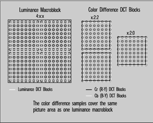 Macroblock: In the typical 4:2:0 picture representation used by MPEG-2, a macroblock consists of four 8x8 blocks of luminance data (arranged in a 16x16 sample array) and two 8x8 blocks of color difference data which correspond to the area covered by the 16x16 section luminance component of the picture (see