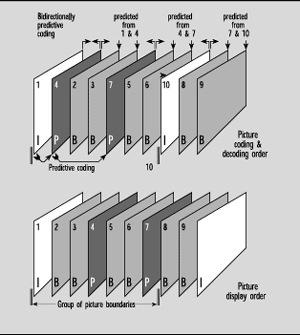 An MPEG encoder must have multiple frame buffers to allow it to change the order in which the pictures are coded. This is known as the coding order. With one frame of buffer memory forward predictions can be used to create the next P frame. With two frames of buffer memory bi-directional predictions can be used to create one or more B frames between the reference I and P frames.