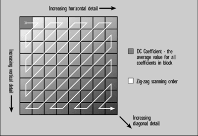 When the DCT is applied, sample data is transformed from the spatial domain--the horizontal and vertical locations of the pixels--into the frequency domain. The resulting DCT coefficients are arranged on the basis of the spectral content of the samples. In figure 9: Ordering of DCT Coefficients, we see how the sample information has been reordered in the frequency domain. The upper left corner of the eight-by-eight matrix of transform coefficients contains the DC coefficient; this is the average value for the entire block. This is the only coefficient required to represent a solid block of luminance or color information.